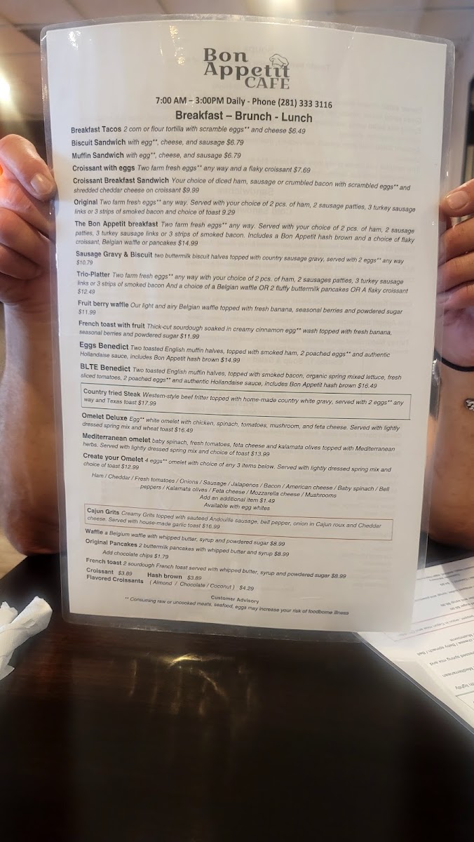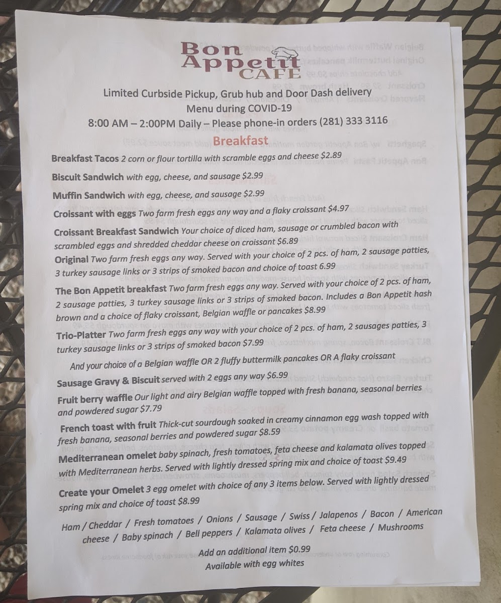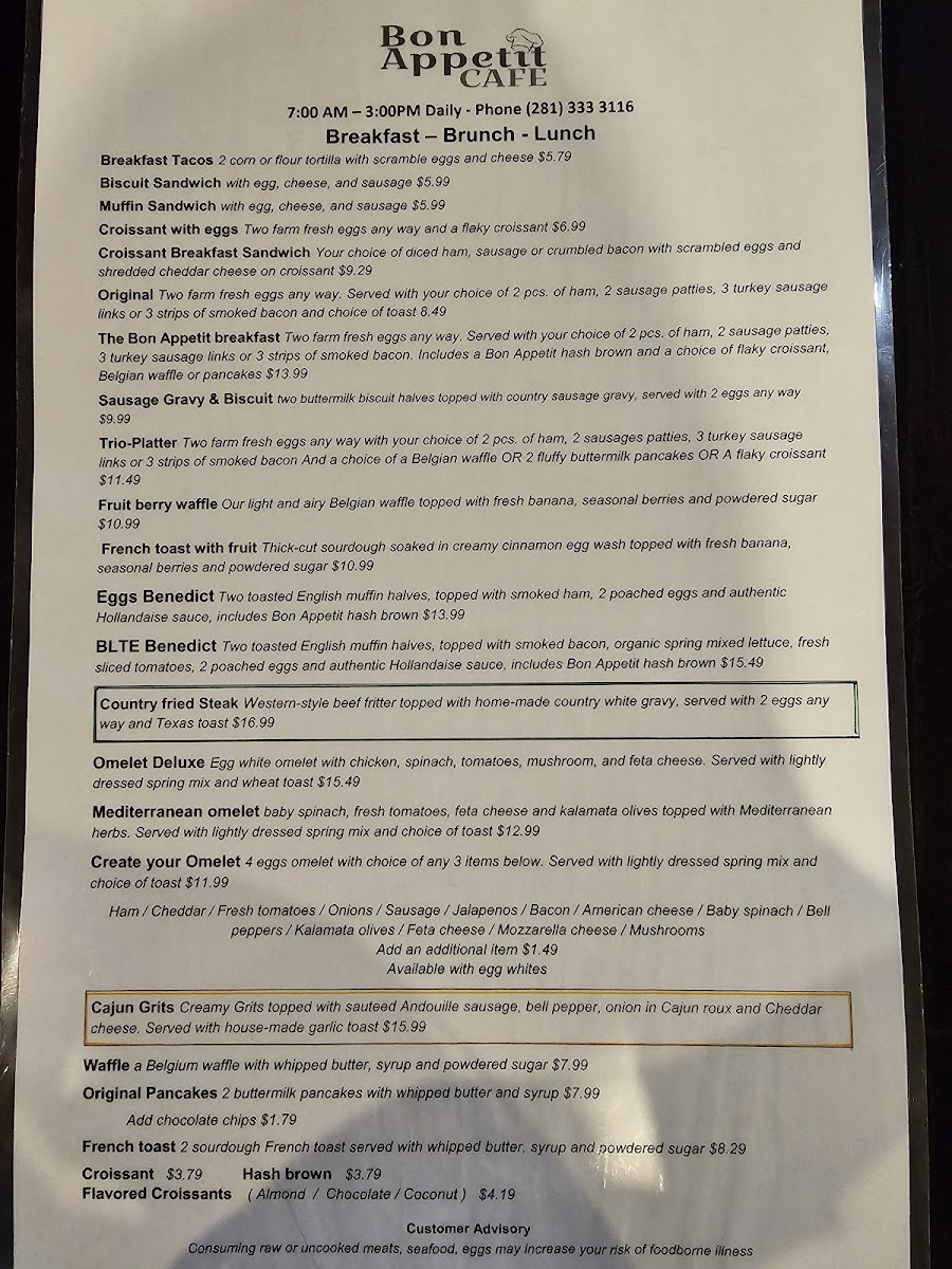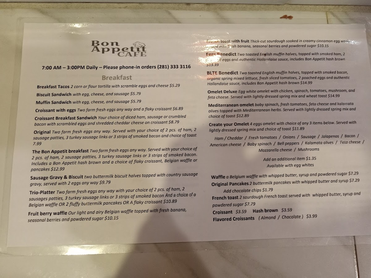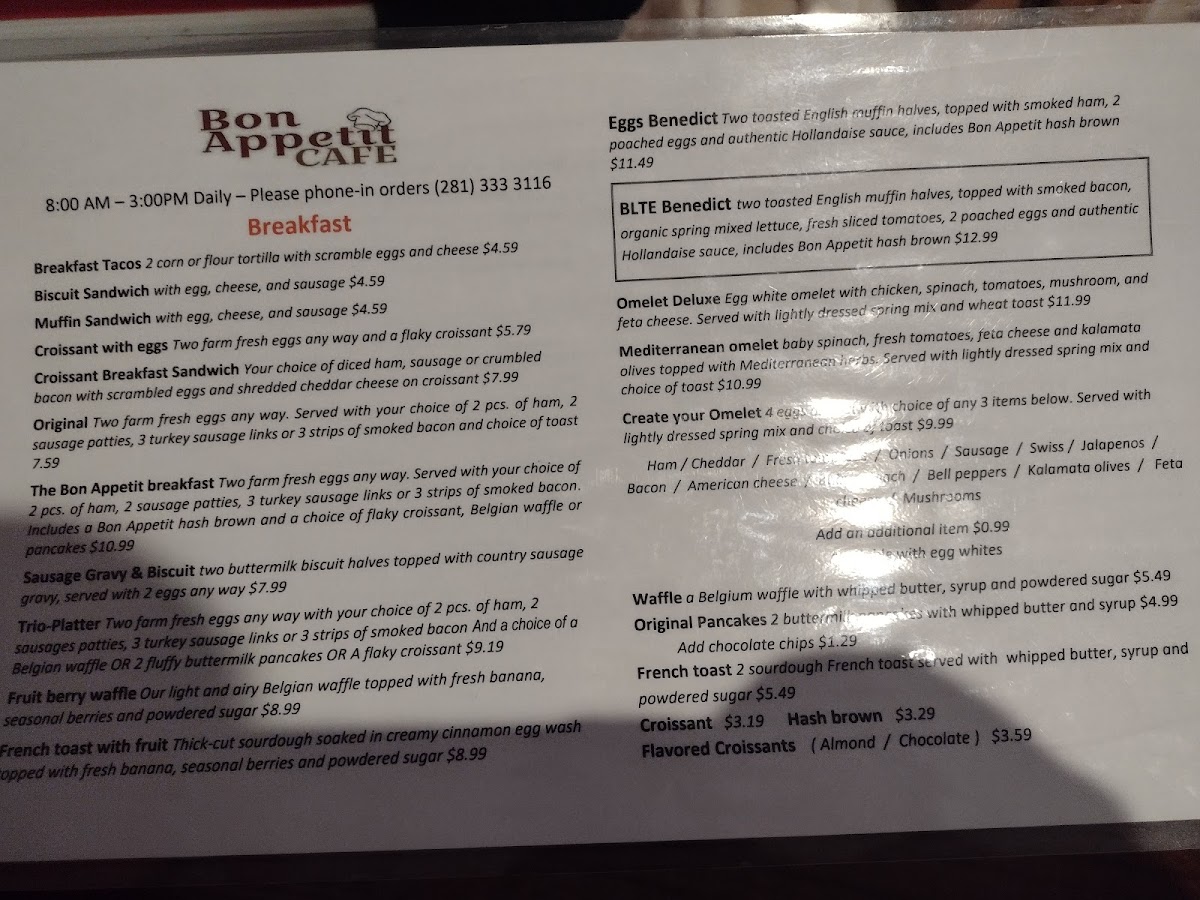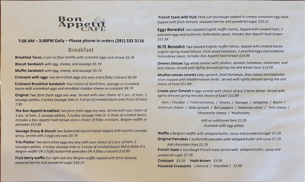 Welcome to Bon Appetit Cafe, a delightful gem nestled in the heart of Houston, TX, offering a memorable experience in traditional American cuisine. With a warm and inviting atmosphere, this café is the ideal spot for breakfast and lunch enthusiasts who appreciate quality food and excellent service.